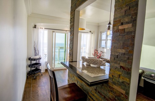 Sleep comfortably and relaxed w/ our plush bed and the sounds of the waves pounding the sand. Its centrally located steps from all the coffee places, restaurants, bars in the Malacon