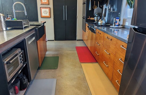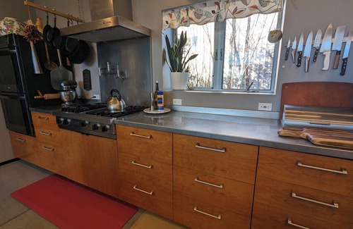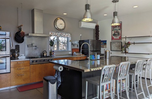 Park on the large gravel drive and come through the gate and lush gardens to your private entrance. Relax and unwind as you step into your main room with a 16 X 16' window of stunning high desert views to watch from your comfy sectional. Make whatever your heart desires with a stainless chef's kitchen, large island and all the culinary tools. Eat at the kitchen island, 8' oak dining table or the table and chairs on the private walled patio outside the sliding doors. Take a nap or get some work done in the downstairs guest room with queen bed and large work table. Head up the oak and steel stairs to the loft and luxuriate in your spacious black slate bathroom with large walk-in shower. Stream your favorite movies and series on the 55" flat screen and surround sound in the tv room or rest on your king bed with Avocado mattress in the loft bedroom while watching the stunning views out to the open high desert behind the house. The guest house is attached to the main house on the opposite end of the building by sound-proof walls. (We will let you know if there are vetted tenants in the guest house during your stay.) We will be traveling during the rental window for the main house.