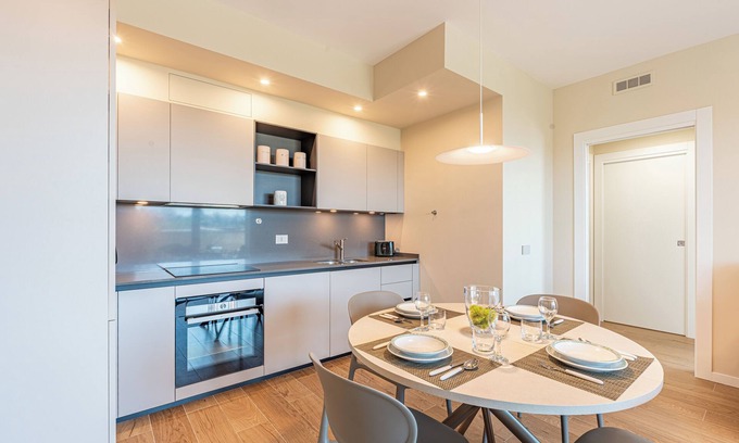 Upon entering, guests are welcomed into a spacious and bright living room with a kitchenette. A large floor-to-ceiling sliding glass door floods the space with natural light throughout the day and opens onto a beautifully landscaped loggia terrace, ideal for enjoying outdoor moments in total tranquillity. The interiors are tastefully furnished with great attention to detail, creating a sophisticated and comfortable ambiance. The living area features a comfortable sofa bed with a 20 cm mattress, a 55” Smart TV, a round extendable dining table, and a stylish, fully equipped kitchen with a traditional oven, microwave, dishwasher, coffee machine, and toaster.