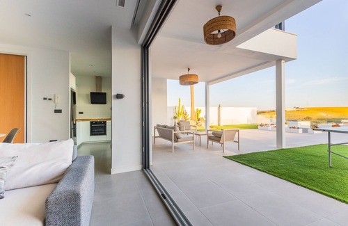 Experience luxury and tranquility in our fantastic apartment with a private pool and golf course views. Just 10 minutes from Jerez, this spacious and welcoming location is perfect for relaxation and enjoying nature. The complex offers private security and is situated on one of the province's top golf courses, next to the Jerez speed circuit. Guests have exclusive access to the entire ground floor seen in the photos, including a patio with an outdoor fireplace, a pool with jacuzzi, a living-dining area, a full kitchen, a bedroom, billiards and ping-pong tables, and a 75' TV with Netflix, Disney+, Amazon Prime, and Dazn. The apartment also includes a private washing machine.