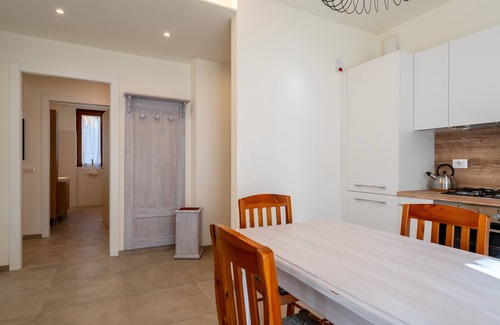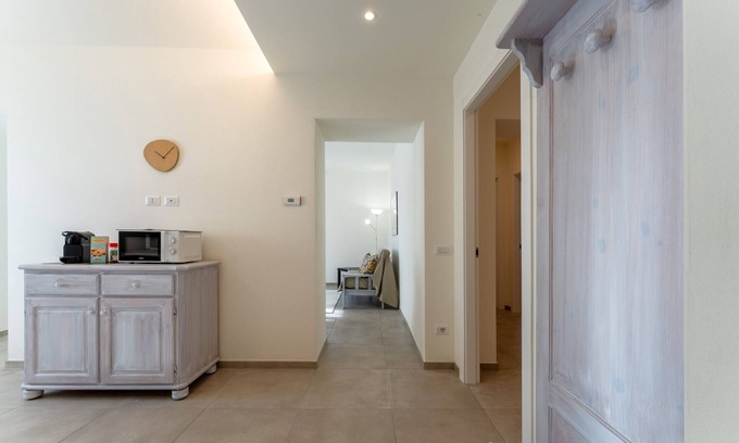 The apartment, located on the ground floor of a three-story villa in a residential area, boasts spacious and bright interiors. The entrance opens onto the living area, consisting of a cozy living room with a fully-equipped kitchen with oven, dishwasher and espresso machine. The sleeping area includes two bedrooms: one with a queen-size bed and one with two single beds. A bathroom with a shower completes the layout.