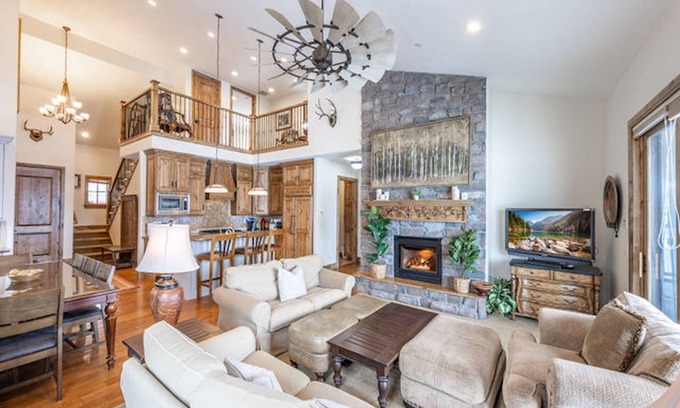 The open-concept great room welcomes you with vaulted ceilings, a stone fireplace, and oversized windows framing views of Deer Valley East Village and Jordanelle Reservoir. Relax with a movie night, enjoy après-ski drinks, or step onto the deck for evening stargazing.