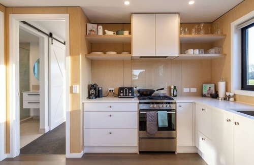 The living area features a comfortable sofa, ideal for relaxing while admiring the stunning outdoor views. For entertainment, there’s a 43-inch smart TV and fast, reliable WiFi, ensuring you can stay connected and stream your favorite shows. In winter you can also snuggle up in front of the wood fire and utilise the supplied board games and books.