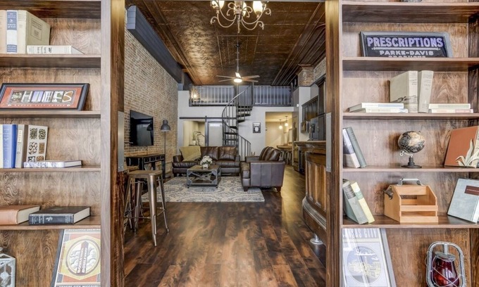 Lincoln’s loft speakeasy suite is a beautifully renovated street level apartment in downtown Lincoln Illinois that was completed in April 2019. With a hidden entrance behind a bookcase entry, Lincoln’s loft Speakeasy Suite is an experience in itself. This historically renovated space is a prime location for entertaining your group downtown. This unit has not only a bedroom downstairs with a queen size bed, but a loft equipped with 2 queen sized beds up the spiral staircase.
