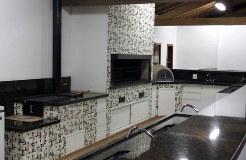 House with 5 suites, accommodation for up to 25 people, toilet, living room, living room with TV, pool table, full kitchen, barbecue, wood stove, pizza oven.
