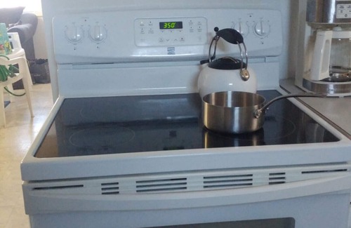 Kitchen has convection oven, good fridge, dishwasher and sink. Coffee machine, dishes and great pots and pans.