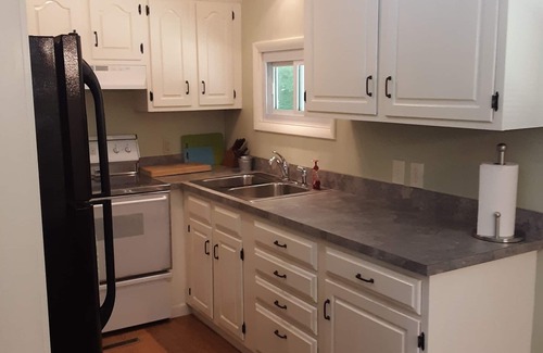 New deck added 2022! Central AC added 2021. Cute cottage in a wooded setting. 2 bedrooms, 1 bath, living room, kitchen, dining area and deck. Cottage is completely furnished with blankets, linens, towels and cooking utensils. Cottage also has toaster, coffee pot, gas grill, outdoor dining table, microwave, cable TV, internet, washer and dryer, games and puzzles. Enjoy relaxing on the deck, accessible through the slider in the living room, or warm yourself during the cool summer nights at the fire-pit in the spacious yard.