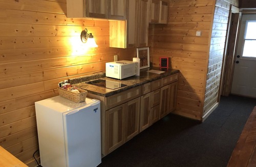 The “Tower” is our newest cabin that includes a 3/4 bath, a simple kitchenette, a back patio for relaxing and a 20’ tower in the corner overlooking the field. (See our picture)