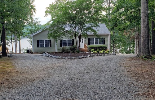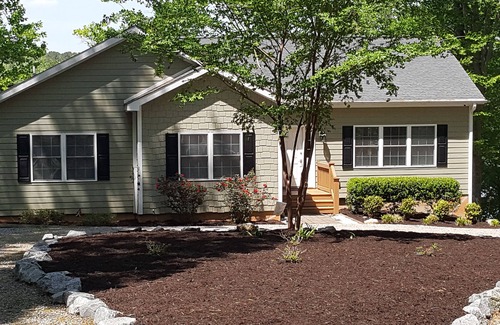 Stunning lake views and fantastic sunsets. There is a large deck, screened in porch for eating, playing games and relaxing. There is a spacious living room with a flat screen TV, cable TV, DVD player and a CDplayer/Ipod dock. The living room has a dining area with seating for eight. Three Sliding Glass Doors offer a wonderful lake view and open out to the deck. The fully equipped kitchen has a counter for eating with four stools. Dining area has seating for six and a door leading to the screened porch. The master bedroom on the main floor has a queen bed and French Doors leading to the screened porch. Master bath has double sinks, shower, jet-tub bath and a large walk in closet. Bedroom 2 on the main floor has a queen size bed and closet. Bedroom 3 also on the main floor has a queen size bed and closet. The finished walkout basement has 2 bedrooms and a full bathroom. One bedroom has one set of bunk beds and two twin beds, the second bedroom has a queen bed. There is a ping pong table, Foosball table and TV. Three sets of French doors lead out to a shaded porch area with a table, four chairs and a hammock for relaxing. The stairs lead down to the dock. The water is approximately 12 feet deep. Perfect for swimming and floating. The dock offers both sun and shade on those hot days. Enjoy lunch on the waters edge at the picnic table. There is an outdoor bar at the dock with 4 bar stools and a mini frig. You tie up your boat or wave runner to the cleats or whips that are provided. There are two kayaks for your use for a little bit of exercise or a scenic view out in the cove. There are chairs, floats and noodles available for your use in the boathouse. There is a private launch ramp if you should bring your own boat and/or wave runner. There are marinas on the lake that offer both boat and wave runner rentals. The home is conveniently located close to Food Lion, Ace Hardware, gas station, restaurants and more.