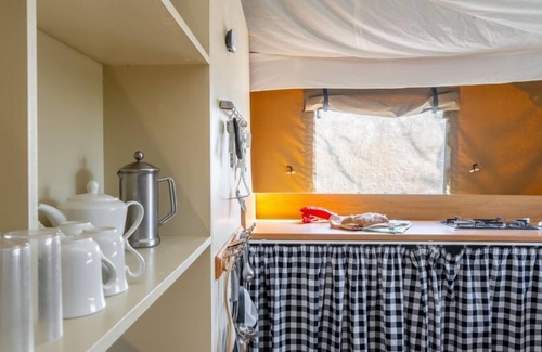 Each of our glamping tents accommodates up to six and has three bedrooms that each sleep two. There is one king size room, one twin room and one bunk bed room per tent. If necessary you could also fit a travel cot in any of the bedrooms (these can be hired if required).