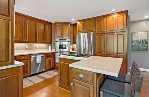 Step inside to discover a beautifully appointed living space where warmth and comfort converge. The inviting living room centers around a magnificent stone wood-burning fireplace, providing the perfect ambiance for cozy evenings and memorable gatherings with loved ones.