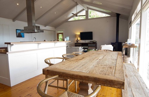 From the living room, bi-fold doors open into a classic kitchen, which features a large Rosier gas stove with double electric oven and a double drawer dishwasher. The open plan dining room, kitchen and family room features a slow combustion wood heater, which also has a pizza oven. There is a large 52” Plasma screen TV with DVD and an Apple TV, and the room has ample seating for the whole family. The home comes equipped with family entertainment such as board games and DVD’s suitable for the whole family. The entertainment jewel is a top-of-the-line multi-zone Sonos sound system for both inside and outside enjoyment.