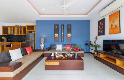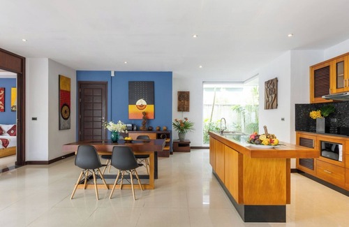The villa features a bright and breezy open-plan living area, fully air-conditioned for your comfort. Unwind in the TV lounge, enjoy meals in the dining area, or whip up your favorites in the fully equipped European kitchen.