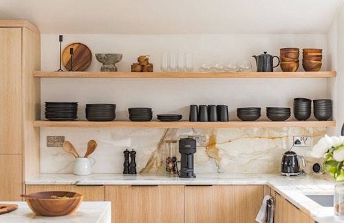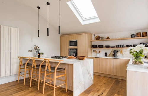 Kitchen with marble worktop, Neff appliances ; oven, built-in microwave and gas hob, Nespresso Coffee Machine (vertuo), Dishwasher, Fridge Freezer and wine fridge. Large social peninsula with three bar stools.
