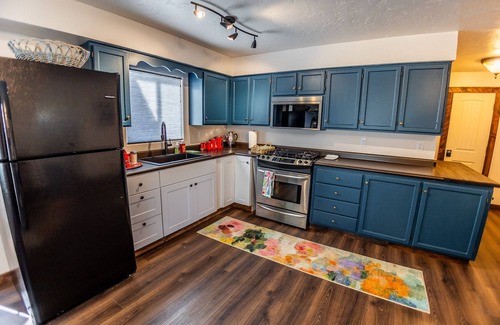 This lovely property features three cozy bedrooms, including a spacious attic retreat, comfortably accommodating up to six guests. The ground floor boasts a full-sized kitchen with modern appliances, a relaxing living room, and a bathroom equipped with a generous walk-in shower. You'll enjoy the comforts of home, enhanced by air conditioning and natural gas heating. Outside, you’ll appreciate abundant parking and an RV hookup, making it easy for guests to join you in celebrating your love amidst the stunning Colorado scenery. Designed with meticulous attention to detail, every aspect of the Little Blue House ensures a delightful stay while promoting a clean, eco-friendly environment.