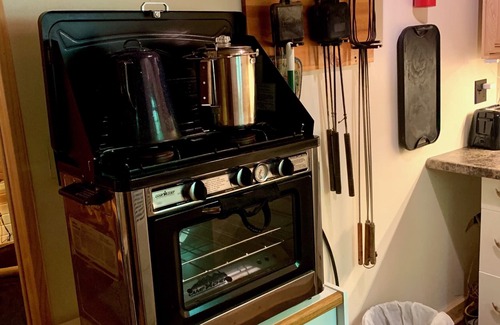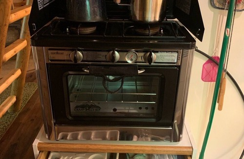 The kitchen has a two burner stove and oven that can hold a 9x13 pan. Although we do not have running water, we do have a hand washing sink as well as a sink for washing dishes. We also provide you with plenty of water for your stay. We also have dishes, utensils, hot dog sticks, fry pie makers, pots and pans, a tripod grill for over the fire and a small charcoal grill (bring your own charcoal).