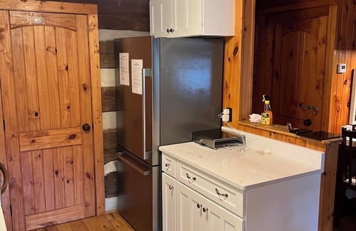 As you approach the cabin you will be struck by it’s picturesque setting. The exterior is authentically constructed from beautiful, antique, hand-hewn logs. This interior will not disappoint! You are greeted at the door by hickory plank flooring and a striking wood-burning fireplace. Complete with two bedrooms, the Master is located on the main level of the property, offering an antique queen bed frame and pillow-top mattress. (Please note that the frame and mattress causes this bed to be HIGHER than normal). The second bedroom and one-half bath comprise the second level of the cabin and house a double and twin bed. This unique cabin is the perfect fit for a couple or small family.