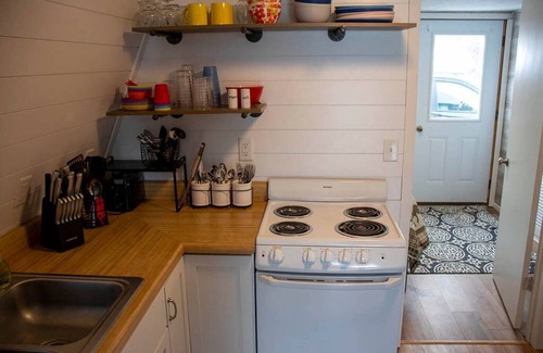 The charming home features a full relaxing bathroom with fresh towels and essential toiletries for maximum comfort.