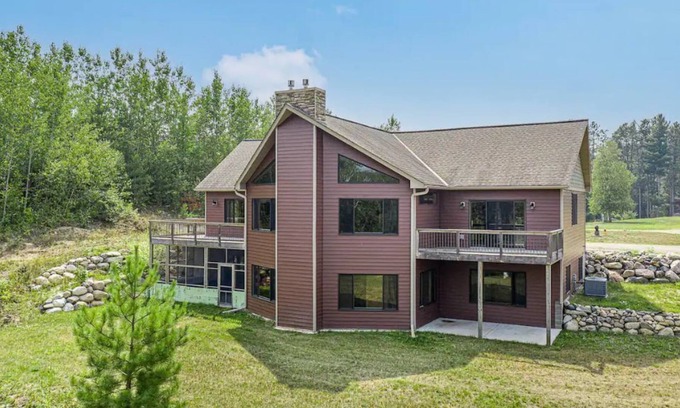 This Luxurious Lodge in the deep woods is tucked down scenic country roads between two lakes. Watch the wildlife walk past from the comfort of the porch or deck; or snuggle up inside to take advantage of views of the lake and all manner of wildlife through the wide windows.