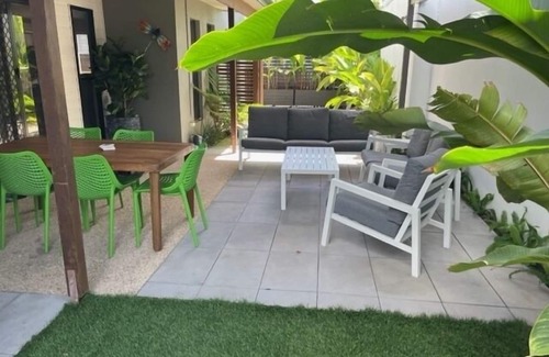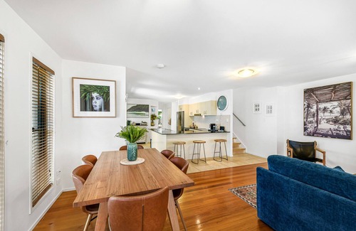 Little Fern Hpuse is pet friendly. Arriving to Little Fern House you will enter the natural light filled open plan living area and dining, which straight away makes you feel like you are on holiday with the coastal / plantation décor. This area then opens onto a relaxing alfresco outdoor seating and dining area that is surrounded by a private tropical garden.