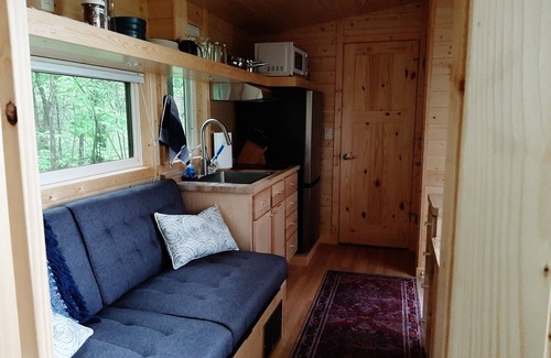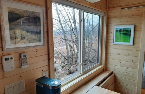 This little cabin in the woods over looking a prairie is a great space for travelers that like to be cozy and secluded.
