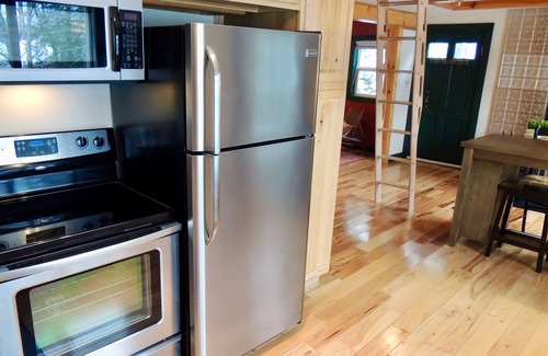 The entire cabin was recently renovated with hickory cabinetry and flooring, stainless steel appliances, and rustic, mid-century modern decor.