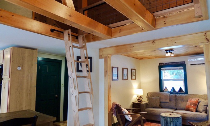 The cabin has one bedroom with a queen bed on the first floor. A wooden ladder with handrails up to a half-floor loft area offers a shared space with an additional queen bed. Individuals staying in the loft should be nimble-bodied.