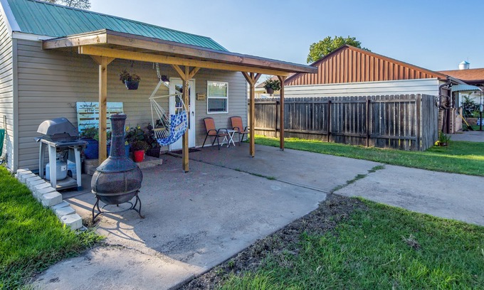 This one bedroom House in the heart of the Midwest has all of the comforts of home! You have the entire property to yourself, complete with a fully appointed kitchen, and laundry in the bathroom. The exterior of the house boasts a large yard, and patio for relaxing. One claim to fame for Ness is the Historic Bank building. I would be happy to arrange a Free tour of this building as I am a member of the Bank Building Foundation. We also have some of the best quail and pheasant hunting around. The house has one Queen bedroom the other portion of the house is living space with fold out couch, fold out ottomans, and futon.