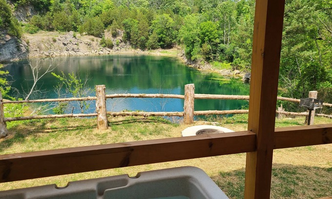 One of the earths truly unique places! Enjoy an experience with the ultra clear blue water of the quarry with fish, high rock cliffs, a raft, and a pedal boat. The cabin is a true log home built for guests to love. Relax on the covered porch with hot tub, rocking chairs, and amazing water views. Entertain yourselves with the arcade, satellite TV, WiFi, Rokus, and backyard games. Fire pit and park style grill are also in the backyard. Fire wood and coffee are provided. Pet friendly. Enjoy!