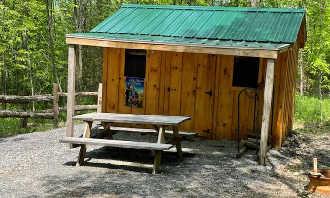 Just minutes from Fillmore Glen State Park, this tiny cabin sleeps 4 in 2 full-size bunk beds. The cabin has a hi-top table and 3 chairs. A step above tent camping, but not quite glamping, this location is perfect for getting away from technology and connecting with nature.
