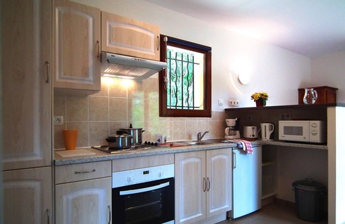 Bedroom with a double bed, dining / living room (with double sofa bed), equipped open kitchen (hot plates, oven, microwave oven, fridge), shower room with sink and toilet, covered terrace.