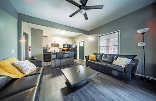 Comfortable Living Room: Sink into plush leather sofas after a day of exploring. Enjoy movie nights on a 40" HDTV with Roku, and stay comfortable year-round with ceiling fans and window AC units.