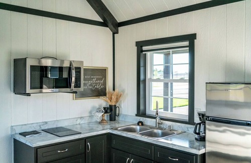 Welcome to your charming Shipshewana retreat! This thoughtfully designed tiny home offers all the comforts you need for a peaceful getaway. Inside, you'll find a cozy kitchenette with a dining area, perfect for enjoying meals at home. The main floor features a queen-size bed, while the loft area offers a second queen-size bed, providing comfortable sleeping space for up to four guests. Relax in the inviting space and unwind in the full-size bathroom with a refreshing shower.
