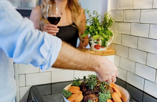 The chef's kitchen boasts induction cooktops and double oven with access to the kitchen garden. Or perhaps you may wish to order a pre prepared slow cooked dinner to pop in the oven at your leisure.