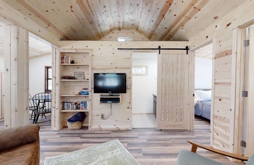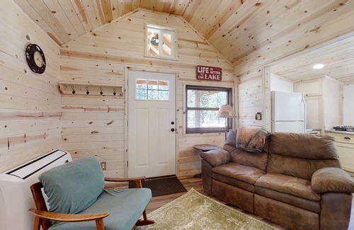 Upon entry, you'll be met with a bright, knotty pine interior and a cozy atmosphere throughout the well-appointed living space. Plush furniture awaits you to rest on after a day of adventuring, as well as a TV for entertainment, with plenty of board games and DVDs to keep you company. A shared fire pit and BBQ area are delightful options to round out your stay.