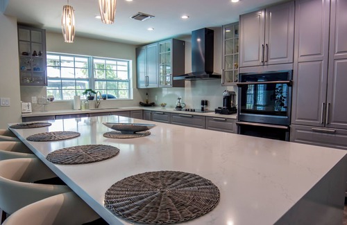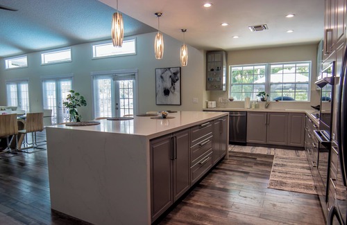 The new kitchen comes equipped with island seating by quartz counter top and dining table for 6 guests to enjoy fine dining or cocktails with friends and family. Equipped with brand new black stainless steel appliances, cookware and dishes for all your cooking and entertainment needs. Tastefully decorated spacious 3 bedroom 2.5 bathroom home with vaulted ceiling wood panels floors and fire place for colder nights, 38-foot long loft overlooking the great room, pool and beyond.