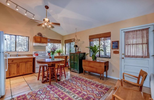 Many ways to fill a day: light a fire in the fireplace and share stories, grill on the back deck, swing on the front porch under cover of the rain, cook in a well-stocked kitchen, high-speed wifi and tv in living room, hike the surrounding Prescott National Forest and Indian Creek.