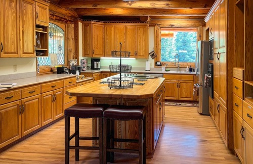 This expansive 7100 sq. ft. home accommodates up to 19, offering a warm, log-cabin feel with modern amenities.