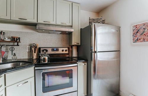 The kitchen is small but functional: it has ample supplies to cook a delicious meal using the ingredients you've picked up from the Farmers Market or local surrounding farms, including a full-sized refrigerator, microwave and stove (there is NO blender, or dishwasher). In the morning, enjoy a fresh cup of coffee from the Keurig while you sit on the covered porch in the back.