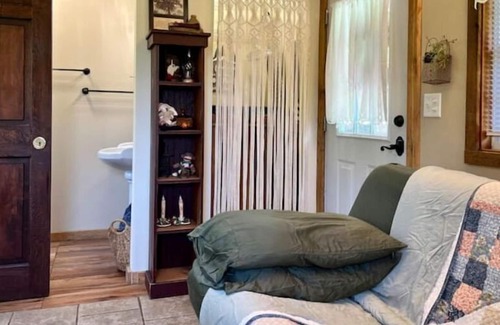 When you step onto the porch, with it's rocking chairs and Edison-style twinkle lights, you will immediately feel the "homeyness" of the tiny farmhouse. Inside you will find a one-room efficiency with a full-size futon which serves as both couch and bed. The mattress is a high-quality memory gel foam, topped with a cooling, pillow-top mattress cover. The tiny house has a full bathroom with shower, very well-equipped kitchen, and hi-speed WiFi.