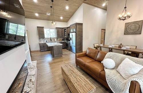 Tucked in the Arizona's serene landscape, this stylish 5 bedroom, 4 bath cabin offers charm and luxury. With decks at the front and back, the home boasts warm interiors and multiple bunk rooms, perfect for gatherings. The master suite is a private haven with an en-suite bath and outdoor shower for a refreshing touch of nature. Enjoy the outdoor jacuzzi under the stars, unwind around the fire pit, and soak in the tranquility. This quaint retreat combines rustic elegance with modern comfort.