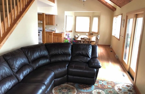 The Lake house has four bedrooms, 3 full bathrooms with room for 8 or for 2 families! The home is complete with a full kitchen, dishwasher, washer, dryer, TV, grill and more. Dining area has seating for 6, main living room has reclining, sectional couch and roku equipped TV. The lower level has a rec room with air hockey and games for the kids.