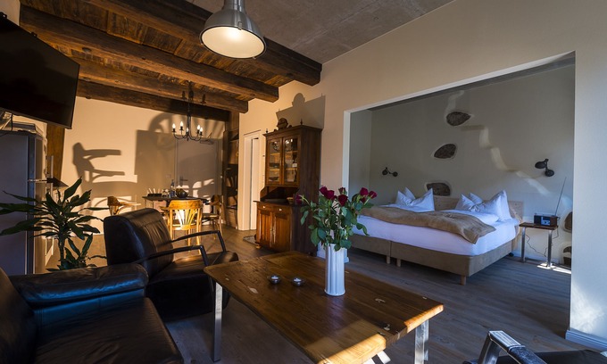 This apartment in. 1 OG is presented in "industrial style". Exposed concrete ceilings in the living / sleeping area have been supplemented in the dining area by a successful arrangement of "rescued" historic bar. In the sleeping area of the apartment to go the revised remnants of the original "firewall" to the neighboring house and the masonry of the "Modern" the 21st century. C. A an interesting symbiosis. The old kitchen buffet, stainless steel kitchen appliances and the black leather couch in the living area complete the picture. The balcony overlooking the leafy courtyard is the "window" of the present. A breakfast can be booked as needed in our Nikolai Cafe (about 15m away).