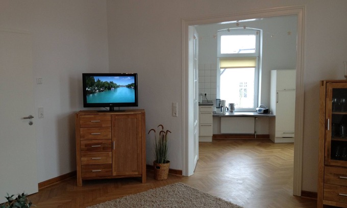 The old building apartment with 60 sqm is located on the first floor of a townhouse. In 2014, the building was renovated with a total of 4 apartments. Bathroom and kitchen have been completely rebuilt. In addition to a double bed in the bedroom, the sofa in the living room can be easily converted into another bed for two people. The city center is within walking distance in 2 minutes. The train station, shopping and various restaurants are nearby.