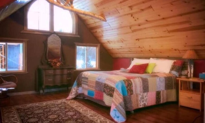 The peacefulness of the outdoors and the large windows to view makes the cabin inviting. The cabin was a former old granary renovated to become a charming, cozy cabin. Not uncommon to step out onto one of two decks (upper and lower), to see up close or to touch one of the friendly visitors that are known as our beloved pets which happens to be horses!