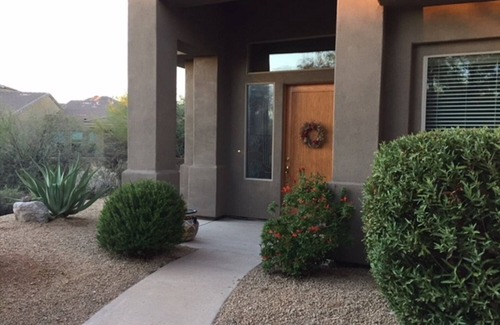 This is my home away from home and I hope you will feel the same. The home sleeps 2-6, is approximately 2000 sq ft and has 2 bedrooms -the master with new king size bed, guest with two new twins and an office/bedroom with a new Bassett hide a bed with upgraded queen air mattress. The master bath includes double vanity, large soaking tub and separate shower. The guest bath includes single vanity with a Mexican hand painted sink, Mexican tile counter top and bathtub/shower combination. The kitchen was just upgraded with new induction cooktop and convection oven, microwave, quarts counter top, composit sink with touchless faucet and filtered water faucet. The kitchen/pantry is well stocked with Safeway, Target and Starbucks are "just around the corner". ***At the front entrance-- I have just added a new low walled very private travertine patio looking towards the natural wash which is wonderful for enjoying morning coffee and /or the beautiful evening Arizona sunsets. Winfield has 8 (6 hard and 2 clay) lighted tennis courts with two tennis pros on staff. Two new pickle balls courts have recently been added. At the wonderful 2025 remodeled club house you can participate in hiking, golf, bridge, canasta, or mahjong groups. The fitness center is well equipped with new machines and free weights and your work-out can be followed by relaxing in the spa or steam room. Yoga and exercise classes are also available for an additional fee. The large year-round heated pool has a "beach" entrance, a fantastic view of Winfield mountain and is surrounded by cool decking with many new tables, umbrellas, comfortable chairs, and chaise lounges. The tennis courts, club house and pool are all just a quick walk from the house. There are several hiking trails in Winfield and close by where you can enjoy the high desert boulders, many kinds of interesting cacti/wild flowers, amazing animals and birds. Also close by are activities such as visiting charming old town Scottsdale, the fun historical cowboy towns of Cave Creek and Carefree - just up the road, in Phoenix the world famous Heard Museum, live theater and many interesting art festivals. Award winning golf courses and of course many outstanding restaurants are also near by --or-- just stay "home"- grill something yummy on the new (2025) built-in gas BBQ and relax -sitting by the cozy gas fire pit enjoying the spectacular Arizona sunsets with a view of Winfield mountain from your own private patio! I hope you will enjoy my "home away from home" . If you have any questions you can contact me by phone under properety manager/owner listing information