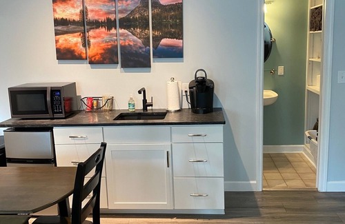While staying at the "Bear Cottage" you will enjoy a comfortable sitting area to relax and read a book or watch tv, a new plush queen bed, 2 seater table, and kitchenette with mini-fridge/freezer, microwave, Keurig coffee maker w/ pods and a full bathroom with all the amenities you need.
