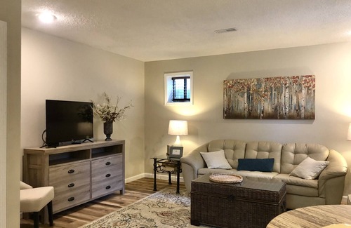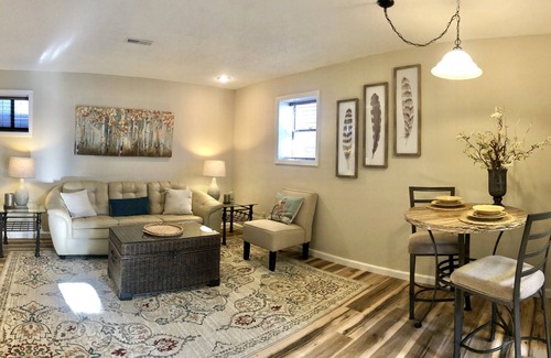 Tucked away privately in the middle of everything, this totally remodeled 2 bedroom, 1 bath apartment has central HVAC, WiFi, stackable washer/dryer combination and private parking. The floor plan is a split entry with living room, kitchen and utility closet on the lower level with two bedrooms and full bath on the upper level. The main bedroom has a queen bed with solid foam mattress, tray ceiling with ceiling fan, sitting chair and a walk-in closet. The second bedroom is set up with a twin bed, desk and chair, chest of drawers and closet. This room is great for use as an office for extended stay guests. The kitchen has an electric range, refrigerator, dishwasher, disposal, microwave and coffee bar. It is fully stocked with dishes, baking ware, pots and pans and more. Within walking distance to banks, restaurants, grocery stores, downtown, the university and hospital, this place is perfect for short trips or extended all-inclusive stays such as for traveling nurses or visiting professors.