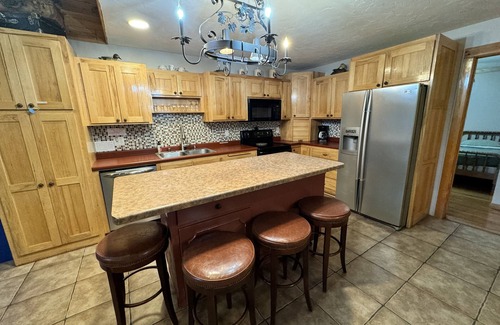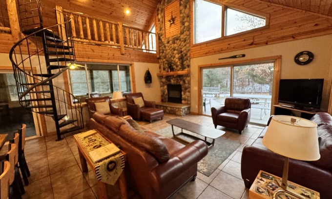 Interior has maple cabinetry, hardwood and tile flooring, pine car-siding and trim, stone surround fire place with electric insert. Mosquito free attached porch for gatherings inside with an outside feel. Porch has additional dining table and chairs. Great value for the sleeping accommodations with all the comforts of home. Base nightly rate is for up to twelve people. Additional guests are $10 per nights per person. All pets are $20 per night per pet. Furniture and amenities may not be exactly as pictures as things are constantly being updated. WIFI included with You Tube Tv streaming service.