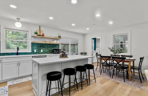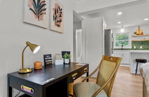 Set in a lovely neighborhood with mature trees, our spacious Hideaway has an open living room, dining area and kitchen with plenty of room for everyone to gather. The dining table seats 6, and there are 4 more seats at the island breakfast bar. Get comfortable on the cushy sofa and loveseat and enjoy a little peace and quiet or turn on the 65-inch TV for movie night. The gleaming kitchen is outfitted with modern appliances, a Keurig coffee machine and the essentials for preparing your own home cooking or serving local take-out fare. When it’s simply too nice out to sit indoors, gather on the large screened porch—in the evening, switch on the charming café lights.